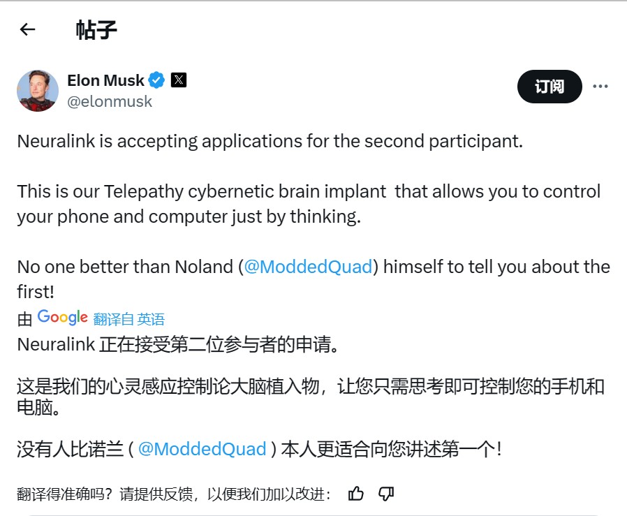 首試成功百天 馬斯克招募第二名腦機試驗者分享到: