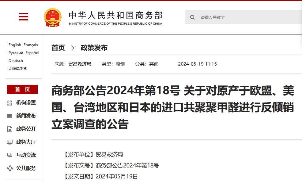 香港新聞網5月19日電 國家商務部今天發佈公告,即日起,商務部對原產於歐盟、美國、台灣地區和日本的進口共聚聚甲醛進行反傾銷立案調查,本次調查確定的傾銷調查期為2023年1月1日至2023年12月31日,產業損害調查期為2021年1月1日至2023年12月31日。