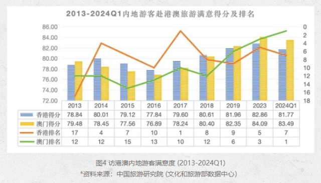 香港新聞網5月29日電 中國旅游研究院昨(28日)發表文章稱,隨著內地赴港澳“個人游”城市的擴容、簽注和通關便利化,以及“澳車北上”等政策落實,數據顯示,今年第一季度,澳門以83.49分的旅游滿意得分,首次成為內地出境旅游者最滿意的目的地,香港排名第七。 根據上述文章的數據顯示,香港排名從2019年的第九名到2023年的第五名,2024年第一季度,以總分81.77至排名第七位。