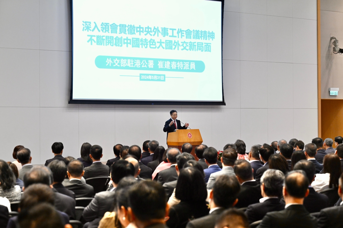 香港新聞網5月31日電 香港公務員學院31日與外交部駐香港特別行政區特派員公署合辦“2024年度國際形勢和中國外交”專題報告會,由特派員公署特派員崔建春主講。行政長官李家超及超過400名高級官員,包括司局長、常任秘書長、部門首長及其他高層首長級人員出席。這次專題報告會亦為今年的“國家外交事務系列”講座揭開序幕。