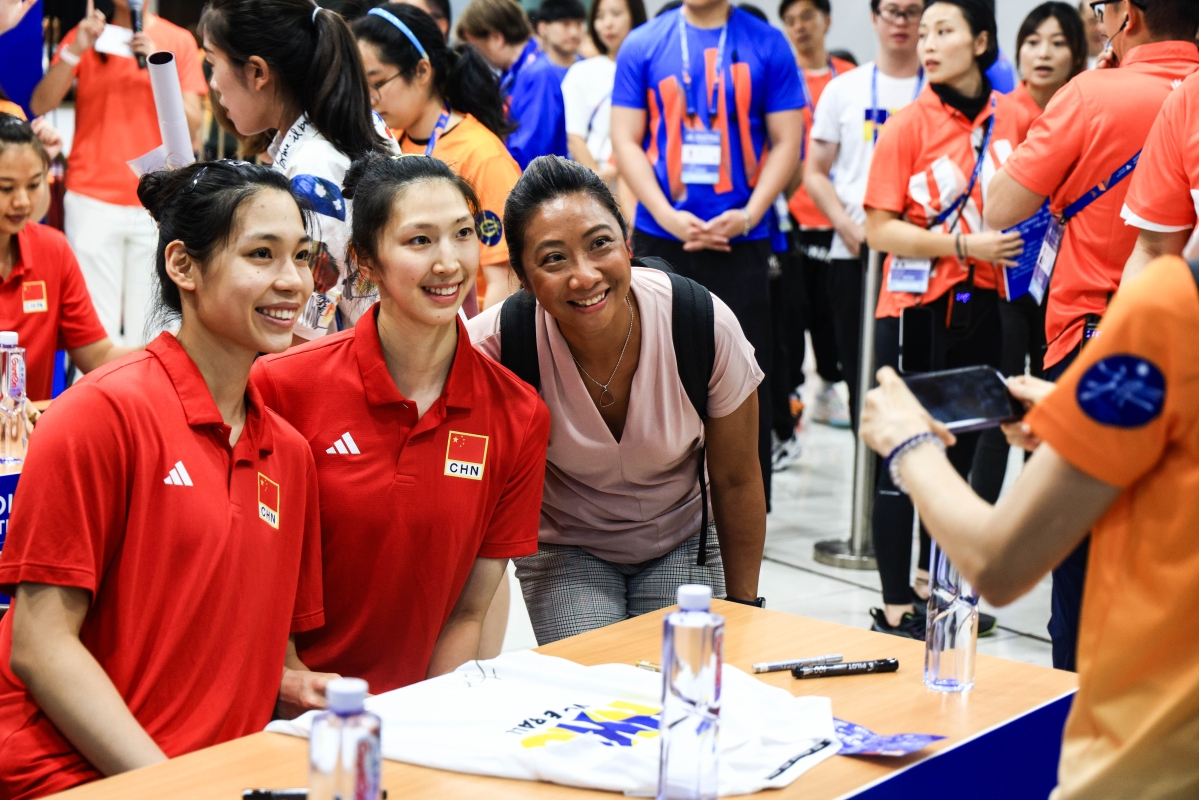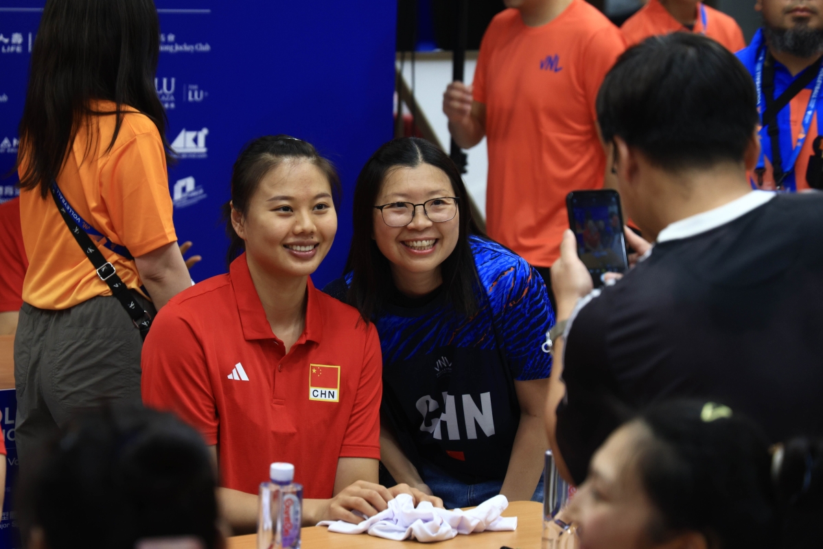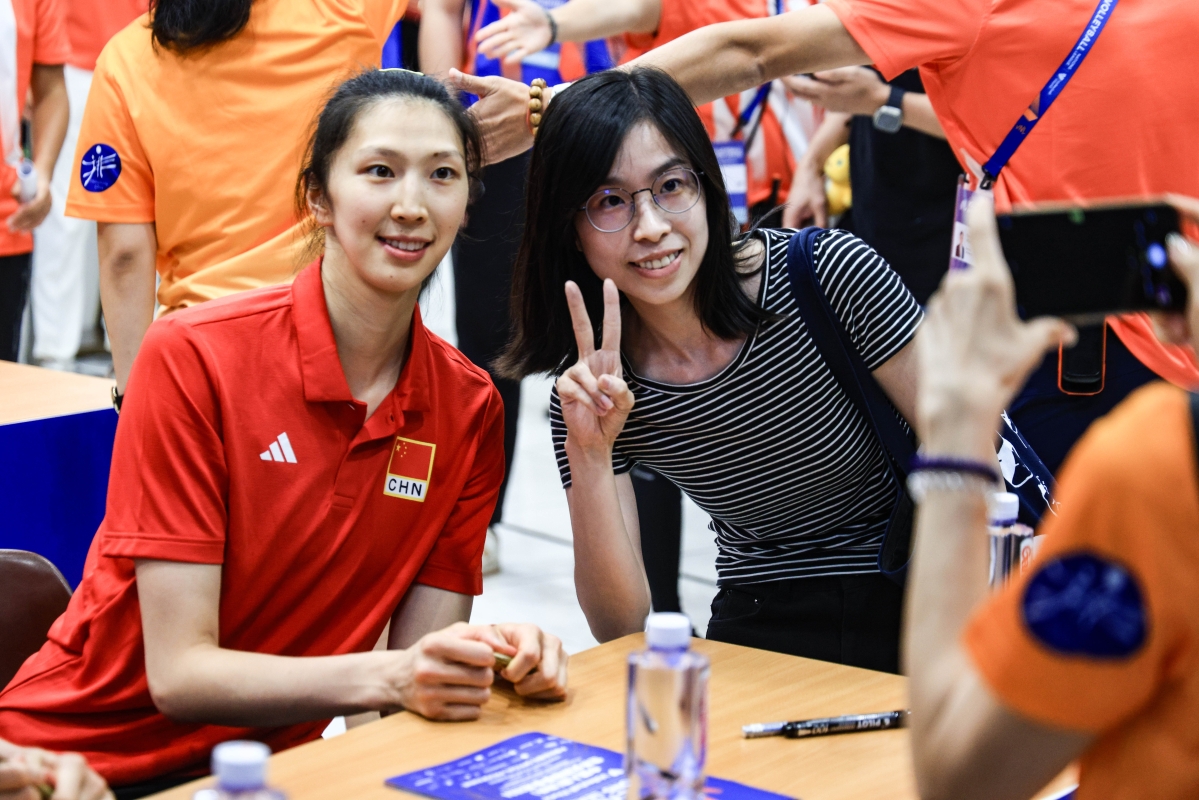 中國女排隊員龔翔宇(左)和球迷合影 【編輯:洪少葵】