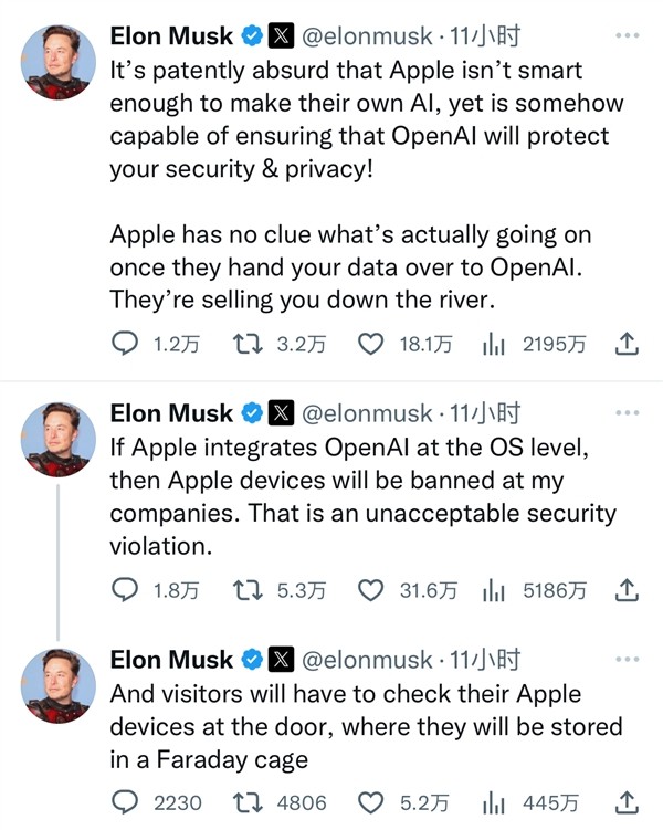 馬斯克炮轟蘋果推文 馬斯克與OpenAI宿怨已久。而這次事情起因是蘋果宣布今年晚些時候將在iOS等系統集成ChatGPT。 馬斯克表示:“蘋果不够聰明,無法製造自己的AI,卻認為能够確保OpenAI保護你的安全和隱私,這顯然是荒謬的!一旦他們將你的數據交給OpenAI,蘋果就不知道到底發生了什麼。他們正在出賣你。” 馬斯克在X上連發7條推文,指責蘋果“出賣用戶數據”。另外,馬斯克警告兩家公司之間的軟件整合是“不可接受的安全違規行為。 馬斯克還威脅稱,如果蘋果在操作系統層面整合OpenAI,就要禁止蘋果設備進入他的公司。 按蘋果計劃,其與OpenAI構建合作夥伴關係,整合對方的ChatGPT。蘋果用戶可以在全系統的寫作工具中調用ChatGPT,實現聊天機器人、圖像生成等功能。并且用戶無需創建賬戶免費訪問GPT-4o,ChatGPT的訂閱用戶可以連接他們的賬戶,并直接在蘋果系統中訪問付費功能。 (完) 【編輯:錢林霞】