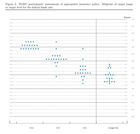 利率中位值顯示,預計2024年底的聯邦基金利率為5.1%,較今年3月預期的4.6%上調50個基點;2025年底的聯邦基金利率為4.1%,較3月預期的3.9%上調20個基點;2026年底的聯邦基金利率為3.1%,持平3月預期。 會後公佈的經濟展望顯示,美聯儲官員保持今明後三年及更長期的GDP增長預期不變,將明後年和更長期的失業率預期小幅上調0.1個百分點,將今年的PCE通脹預期和核心PCE通脹預期增速均上調0.2個百分點,明年這兩個通脹指標的預期增速均上調0.1個百分點。 與上次相比,本次會議聲明還有兩大變動:一是有關通脹進展的措辭上,對通脹的描述從“缺乏進一步進展”,改稱“取得了適度的進一步進展”;二是删除了縮減資產負債表計劃變動的具體操作表述,只提到會繼續減少其持有的美國國債、機構債務和機構抵押貸款支持證券。(完) (風險提示:本文內容僅供參考,不構成投資建議。) 【編輯:錢林霞】