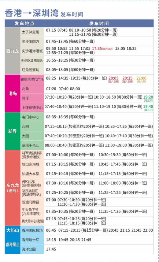 香港新聞網6月21日電 進入6月的尾聲,環島中港通發佈消息,為迎接即將到來的香港“七一小長假”和暑假學生長假,便利港人去往內地旅游,明日(6月22起)起香港往返深圳灣加密班次,繁忙時20分鐘一班。 跨境直通巴士是往返香港及大灣區各個城市最方便的方法之一,跨境直通巴士的最大賣點是點對點的服務,直達大灣區各個城市的市中心。據環島中港通消息,香港各區往返深圳灣加密班次。從港島區站點出發的上環信德中心、灣仔、銅鑼灣時代廣場,繁忙段加密至約20分鐘一班; 東九龍(兩線)站點,將軍澳健明邨、將軍澳東港城、裕民坊凱匯、觀塘馬蹄徑、牛頭角下邨、油塘大本型、啟德AIRSIDE、黃大仙中心,繁忙段加密至約20分鐘一班;西九龍站點,太子砵蘭街繁忙段加密約20分鐘一班;海港城、尖沙咀K11 MUSEA:加密至約30分鐘一班;尖沙咀圓方:增至每小時一班;旺角朗豪坊增至每小時一班; 新界區站點,沙田、大圍、荃灣德海街繁忙段加密至約20分鐘一班;至於屯門市中心,加密至約每小時一班。