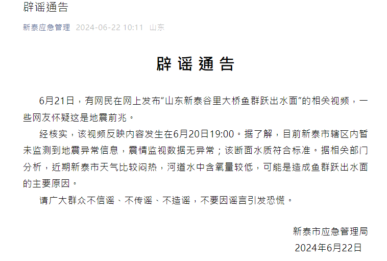 經核實,該視頻反映內容發生在6月20日19:00。據了解,目前新泰市轄區內暫未監測到地震異常資訊,震情監視數據無異常;該斷面水質符合標準。據相關部門分析,近期新泰市天氣比較悶熱,河道水中含氧量較低,可能是造成魚群躍出水面的主要原因。 請廣大群眾不信謠、不傳謠、不造謠,不要因謠言引發恐慌。(完) 【編輯:刘春】