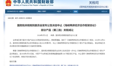 香港新聞網6月25日電 據台灣《工商時報》24日報道,大陸商務部6月15日起中止134項ECFA(海峽兩岸經濟合作框架協議)早收清單零關稅優惠。台灣機械工業公會判斷,島內機械設備年出口值將因此減少上億美元,在大陸市場佔有率下降4%至5%。