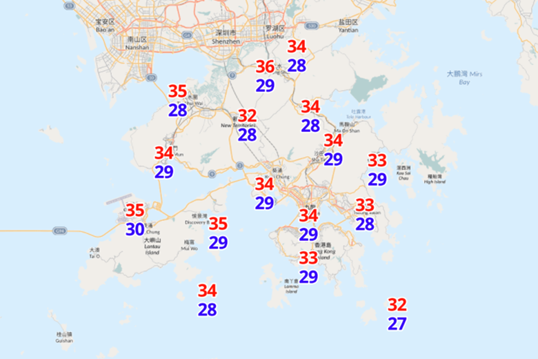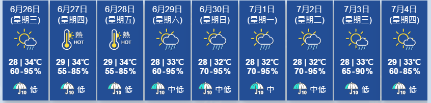 香港地區6月26日自動分區天氣預報(最低氣溫、最高氣溫)。截圖自香港天文台 香港天文台指,受副熱帶高壓脊影響,未來一兩日中國東南部普遍晴朗及酷熱。預料一股西南氣流會在週末期間至下週初,為廣東沿岸帶來驟雨及雷暴,該區仍然炎熱。而副熱帶高壓脊會在下週中期再度覆蓋中國東南部。