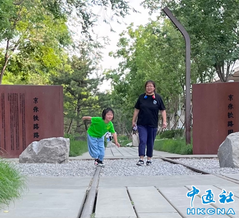 京張鐵路遺址公園,由高架橋改造的“日落客廳”。 香港中通社圖片 住在附近的居民陳凱指著標識牌說,“這里原來是京張鐵路的一處道口,一直有火車經過,十分吵鬧,但現在安靜了,因為環境改善了。” 陳凱口中的京張鐵路,建成於1909年,是第一條由中國人自主設計建造的國有幹線鐵路,其主線穿北京城區而過,因其第五個道口與主街道相交,此交叉處得名“五道口”。“以前經過這里,經常要停下來等火車先通過,很不方便,行人避之不及。”陳凱說。 為此,北京官方花了大力氣來改造。從“五道口”站步行3分鐘,就能看到一條鐵路小徑,銅質雕塑似門,京張鐵路舊枕石鋪路,兩側鮮花簇擁。隨著京張鐵路部分入地,位於交叉處的既有地上舊線,被改造為“京張鐵路遺址公園”。 “現在,不僅行人暢行無阻,而且還成了一處鬧中取靜的休閑好去處。”陳凱說,鐵路護欄、老鐵軌、枕木、水鶴等鐵路元素穿插在公園中,景觀氣質獨特,吸引不少青年和附近居民聊天小憩。