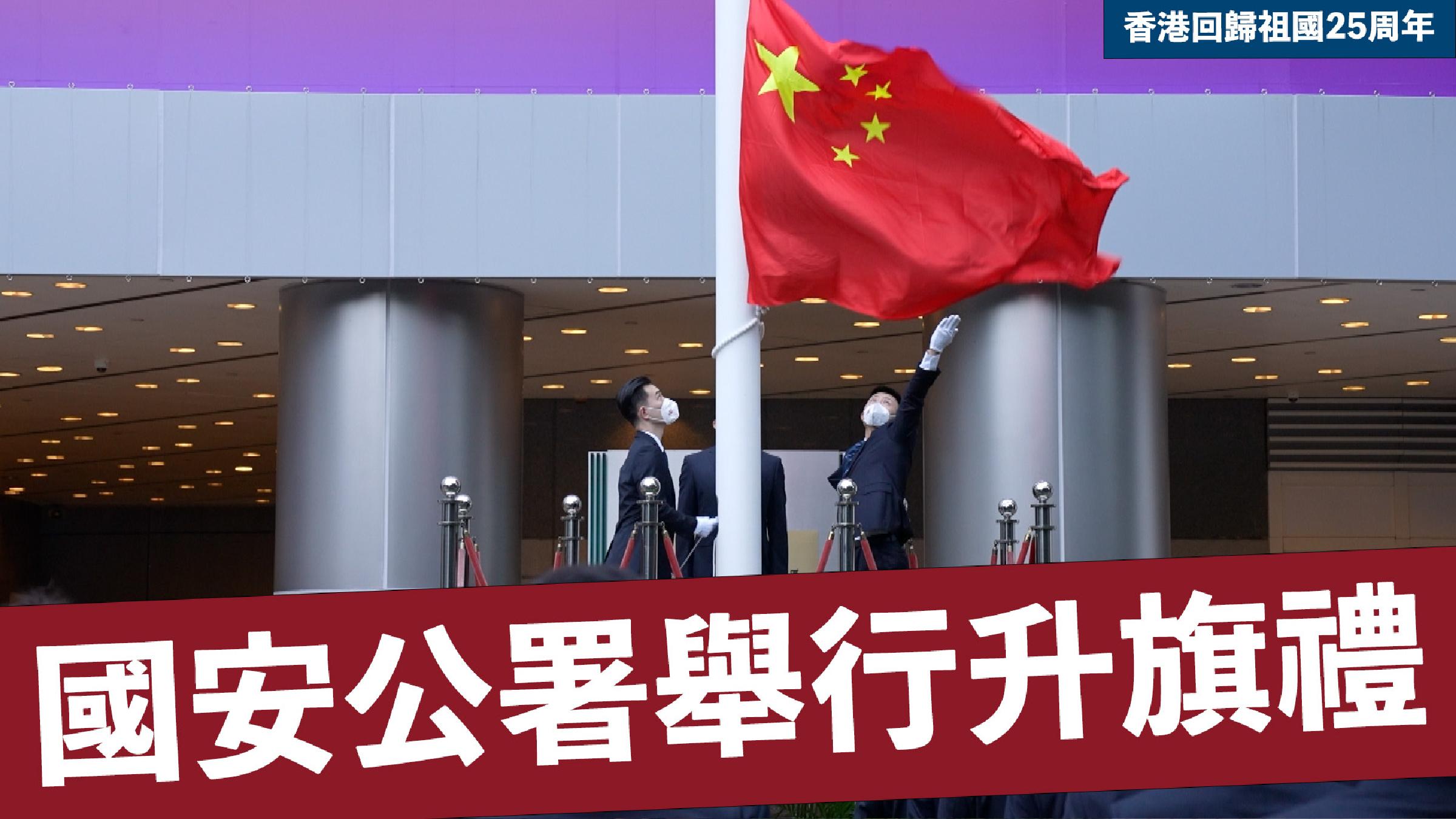 早上7時整,駐港國家安全公署領導和幹部代表在駐港國家安全公署總部大樓前整齊列隊肅立。在口令聲指揮下,護旗手英姿挺拔、步伐堅定,護衛著五星紅旗走向升旗台。伴隨國歌莊嚴雄壯的旋律響起,鮮艶的五星紅旗冉冉升起、迎風招展,全體幹警注目仰望國旗、齊聲高唱國歌,忠誠致敬黨的生日,由衷祝願偉大祖國繁榮昌盛、香港長期繁榮穩定。(完)