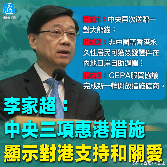 李家超今日出席行政會議前見記者時表示,在本屆政府即將開展第三年工作之際,中央公布這三項惠港措施,連同昨天開始、內地居民旅客行李物品免稅額度提高至15000元人民幣,均顯示出中央對香港的支持和關愛。