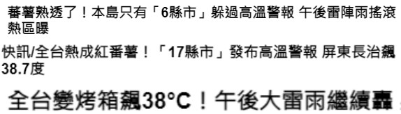 香港新聞網製圖 近來,台“氣象署”的“高溫特報”已成台灣頭條新聞的“常客”。據今日(4日)“高溫特報”,全台10個縣市亮橙色燈號,有連續出現36度高溫的機率。有專業人士稱,未來7天全台持續高溫酷熱,“還看不到盡頭”。“番薯熟透了”“燒番薯加柴火”“像被關進烤箱”……隨手一搜索,光看台媒報道的標題就能感受到台灣最近到底有多熱。