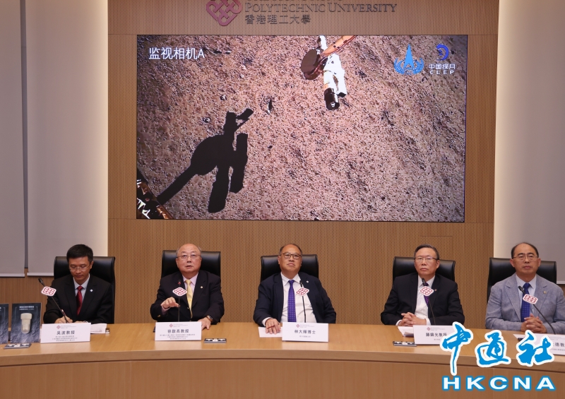 (香港中通社記者 曹文毓攝) 香港中通社圖片 香港理工大學深空探測研究中心主任容啟亮教授介紹,此次獲得的月壤表面鏟取樣品,是由理大團隊為嫦娥五號研製的表取採樣執行裝置採集而成。