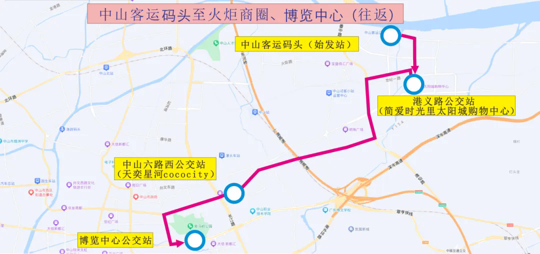 中山博覽中心至鎮街主要商圈環線 4、中山客運碼頭至博覽中心線 途經站點: 中山客運碼頭、簡愛時光裡太陽城購物中心(港義路公交站)、天奕星河COCO City(中山六路西公交站)、博覽中心站 服務時間: 中山客運碼頭—博覽中心:9:50-17:50 博覽中心—中山客運碼頭:10:35-18:35 班次間隔:2小時/班