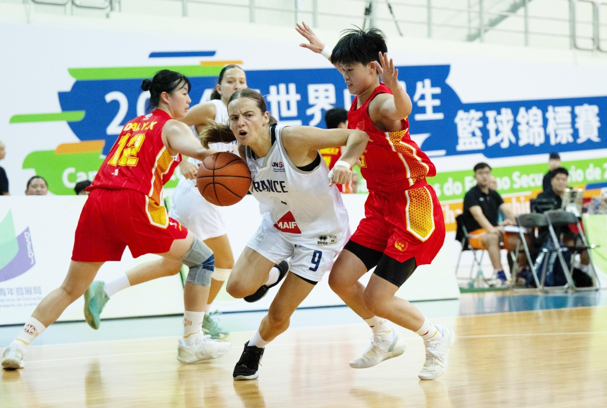 7月2日,世界中學生籃球錦標賽在澳門塔石體育館舉行,中國一隊(红衣)在女子組決賽中,以72:65擊敗法國稱后。 (香港中通社圖片)