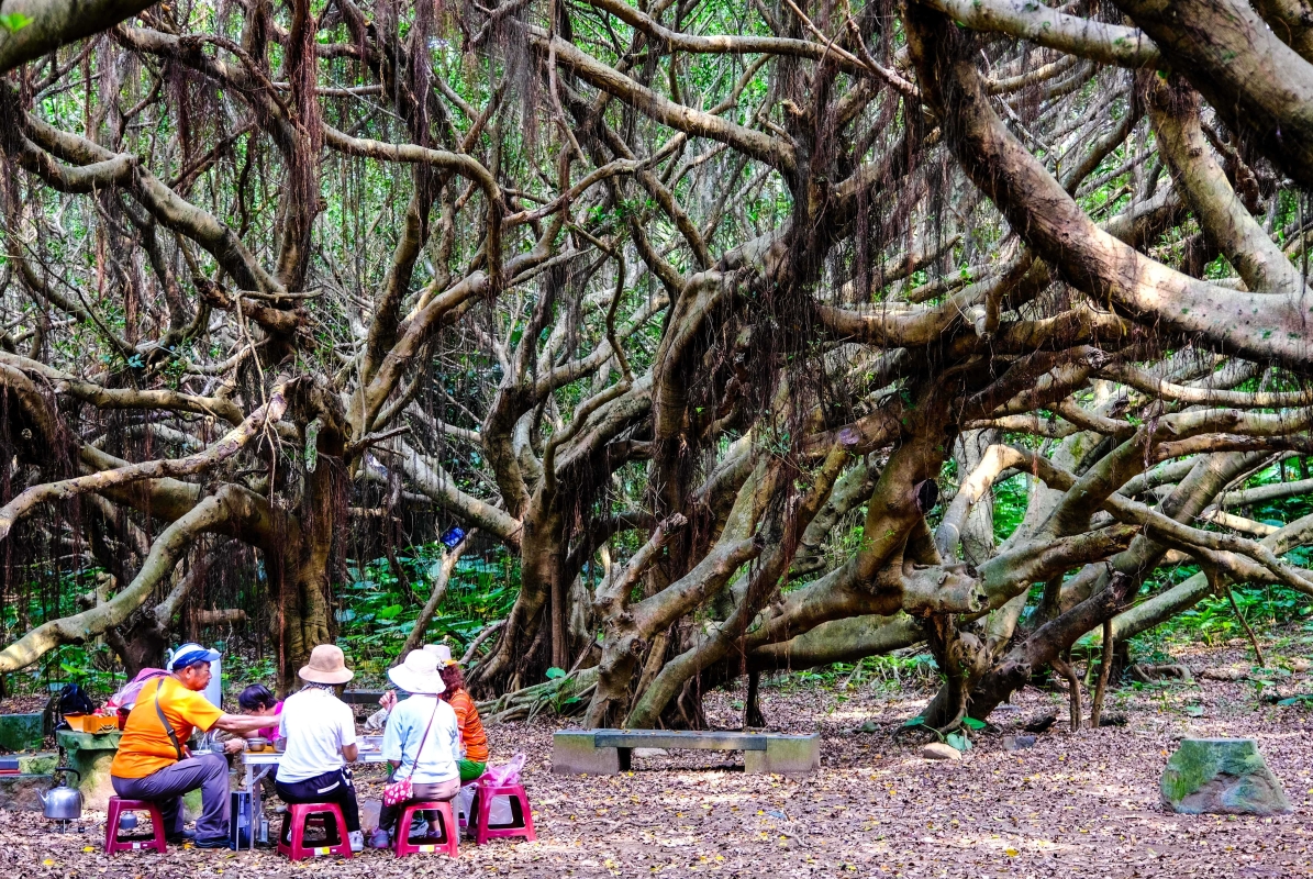 台灣新北市石門區的老梅,有座紅色磚牆交替連結成彎曲又繁複的走道,這新奇有趣的設計讓許多遊客玩得不亦樂乎,號稱“老梅迷宮”。迷宮坐落在老梅大草皮上,充滿神秘的圖騰感,加上“風剪樹”逆境生長的老榕樹,盤根錯節的奇景,彷彿是一座外星人的遺跡,成為民眾造訪北海岸必拍的熱門打卡景點。圖為盤根錯節的老榕樹下是遊客們休憩的理想場所。 (香港中通社圖片)