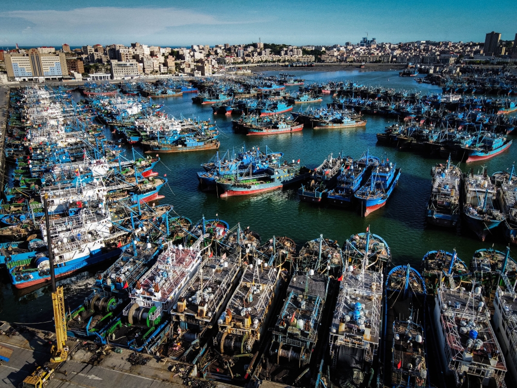 正值伏季休漁期,停泊在福建省祥芝中心漁港的幾百艘大型漁船蓄勢待發,靜候著新一輪的耕海牧漁徵程,碧海、天空、漁船形成一道獨特的風景線。(香港中通社記者 許其皓攝)