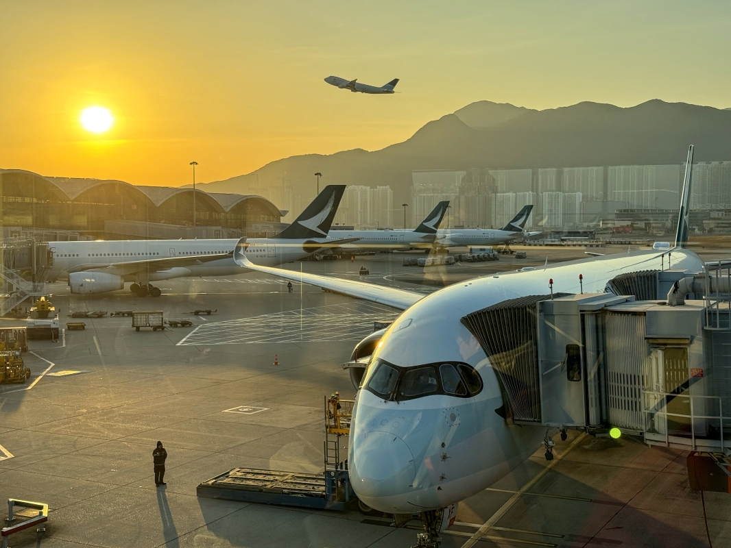 香港機場管理局3日晚發表截至3月31日止的2023/24年報,指香港國際機場航空交通量錄得顯著增長,近期旅遊高峰期的客運量及飛機起降量均回復至疫情前水平的80%,預計今年底前完全復甦。圖為在晨曦中準備起飛的國泰航班。(香港中通社記者 徐文峰攝)
