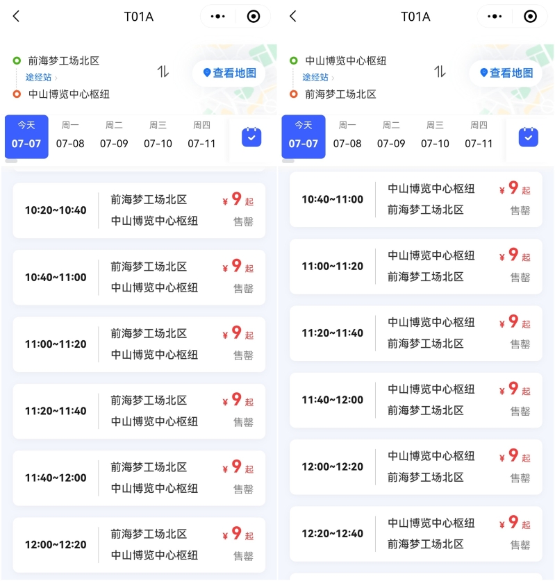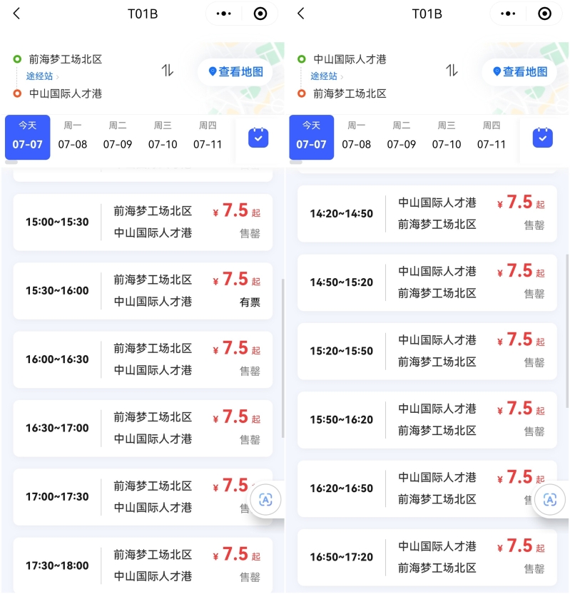 市民排隊搭乘深中快線。(圖源:香港新聞網) 小編發現,不僅免費專線人氣爆棚,所有售賣深圳、中山往返車票的購票平台都車票緊張。 周日(7日)一大早,公交T01A“深圳前海夢工廠北區”往返“中山博覽中心樞紐”的車票早已售罄,公交T01B“深圳前海夢工廠北區”往返“中山國際人才港”的車票也幾乎被搶購一空。 而其他售賣深圳中山往返的長途汽車售票平台,18元的特價票也全部售罄,只剩下28元的正價票。