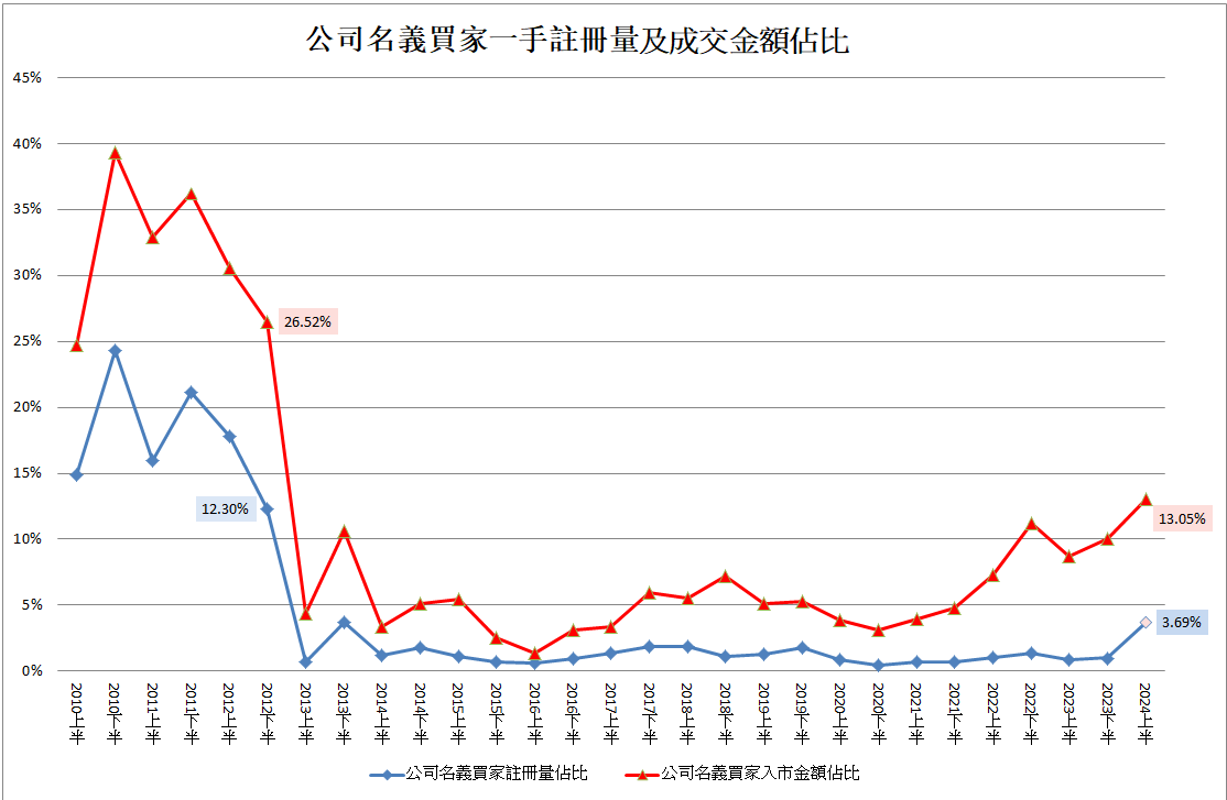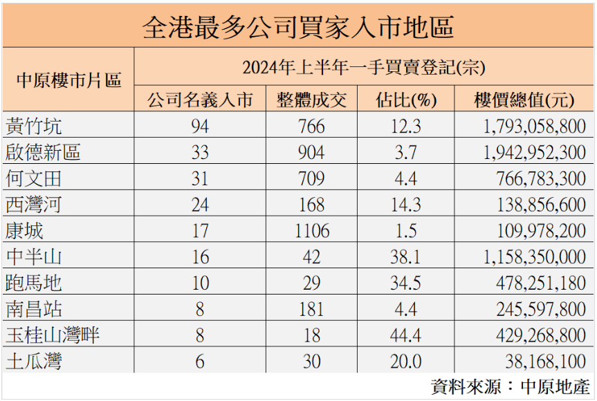 中原地產數據。 近期一手樓市投資氣氛升溫,上半年已有331宗公司客入市,與去年同期50宗相比,大幅急升5.6倍,為2012年下半年錄得873宗後的近12年最多。陳永傑稱,於撤辣前,新盤公司客成交量寥寥無幾,去年全年僅89宗,今年1、2月亦僅9及6宗。但在撤辣後樓市最旺的3、4月,爆升至135及126宗,意味撤辣後的一個月公司客買樓數量,已多過去年全年。成交金額方面,上半年公司客於新盤市場所涉及的總入市金額,佔比升至13%,達143億元,同創12年新高。