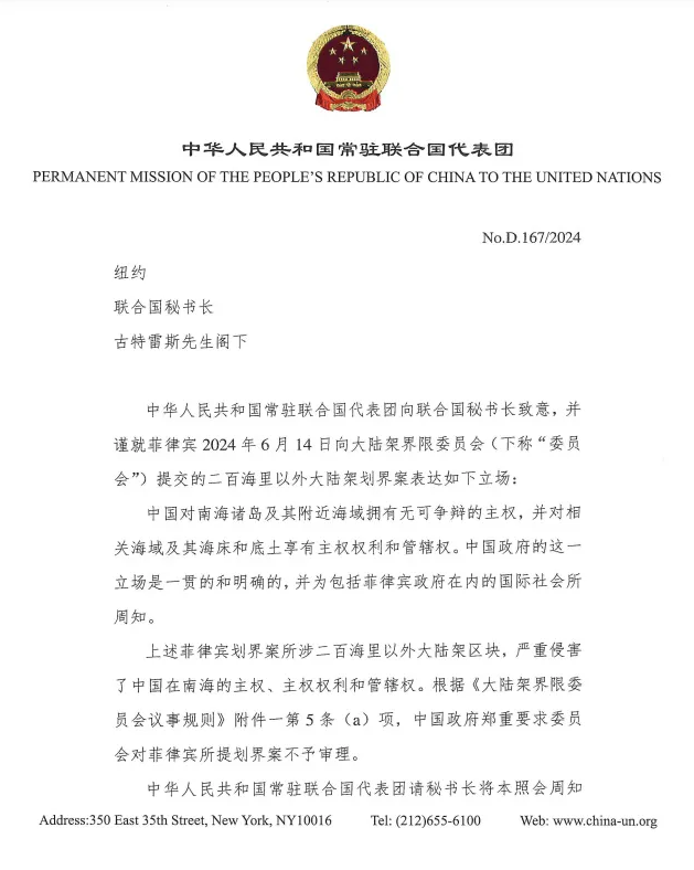 中國駐聯合國代表團向聯合國秘書長髮出照會要求不審議菲律賓劃界案。 到了7月7日,馬來西亞外交部長穆罕默德·哈山(Mohamad Hasan)也表示,馬來西亞已向聯合國發出外交照會,抗議菲律賓向聯合國大陸架界限委員會提交所謂“南海外大陸架劃界案”。