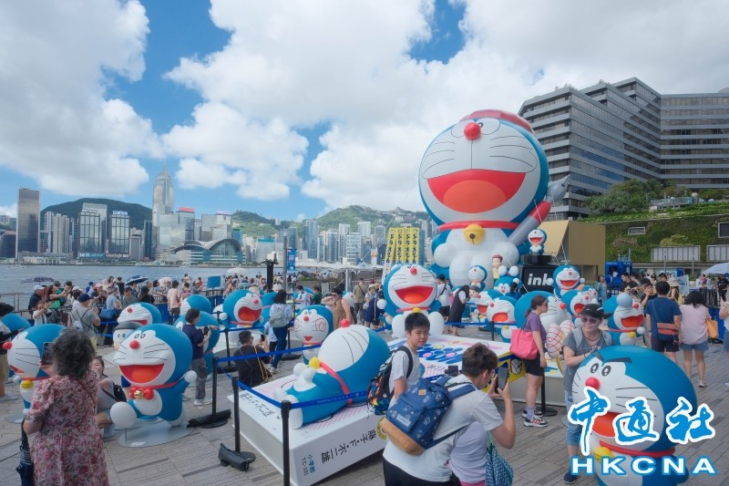 香港中通社圖片 今次展覽分收費和免費展區,位於K11 MUSEA 的收費展區開放至下月18日,門票已全部售罄。設於星光大道暨海濱的免費展區則開放至下月11日,部分展區市民及遊客需預先於網上登記。 同時,即日起至下月8日,十道高逾兩米、1:1原大尺寸的多啦A夢法寶“隨意門”將遍布港九,旅客和市民可找尋粉紅門框打卡和換領限量紀念品。 記者見到,外展區以全球最高12米的多啦A夢充氣雕塑最為矚目,環繞逾30個小型多啦A夢及其10名親友以巨型漫畫列陣。“100%星光大道”內,多啦A夢與好友大雄等穿上禮服,沿海傍陪伴13位香港電影工作者的漫畫人形立牌。 當日早,香港天文台發出酷熱天氣警告,仍難擋“多啦A夢迷”的熱情。記者見到,不少粉絲早早到場搶佔位置打卡拍照,並預備搶先到紀念品專賣店搶購。 有移美20年的港人陳先生暑期與家人返港,特意身著多啦A夢元素衣服參展。他表示,自小便是多啦A夢粉絲,多年來已收集過百件多啦A夢周邊產品,平日亦會讓小朋友通過看多啦A夢學中文,希望通過展覽追尋自己童年回憶。 有旅客對這次展覽的精緻度讚不絕口,預計在展覽花費過千港元購買紀念品帶回去給朋友。有菲律賓旅行團當日也來到展區,興奮地表示場景讓他們童年“夢想成真”。 K11集團創辦人鄭志剛指出,今次展覽不僅是城中盛事,更是展現文化IP交流的範例。展覽突顯香港作為中外文化藝術交流中心的國際地位,同時帶旺旅遊、餐飲、零售等行業,推動經濟效益,並為市民帶來幸福感,可謂通過文化IP交流而促進經濟的典範。 旅遊促進會總幹事崔定邦表示,最近一個月或有200至300萬旅客訪港,十居其九也會來參觀多拉A夢展覽,認為展覽對遊客有極大吸引力。香港酒店業主聯會執行總幹事徐英偉認為,7月訪港旅客數字明顯上升,期望暑期有多些類似多啦A夢展覽的主打項目吸客,料7、8月酒店入住率最高達90%。 另外,為召喚多啦A夢迷再次尋回集體回憶,多啦A夢無人機表演將於20日在尖東上空上演,再次點亮維港。(完) 【編輯:王瑶】