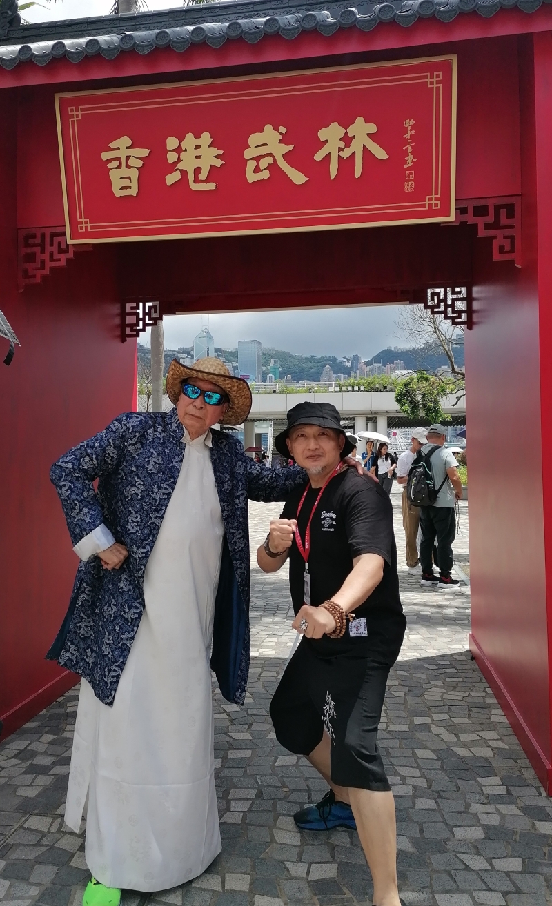 國家級非物質遺產“五祖拳”傳承人洪少葵與香港影視演員、洪拳大師趙志淩(左)在功夫街宣傳 【編輯:曹文毓】