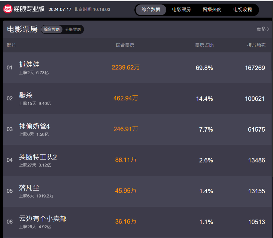 電影《抓娃娃》位列票房第一。 以“沈馬組合”領銜主演的電影《抓娃娃》為代表的國產電影,在這個夏日吸引了大量影迷走進電影院。據悉,僅在點映及預售階段,《抓娃娃》便取得了超過5億的票房佳績。 今年暑期檔,國產電影在現實題材創作方面持續發力,影片《默殺》上映後熱度不斷攀升,反映出人們對於校園霸淩的懸疑類題材的持續關注。同時,電影院也適時安排暑期檔中針對學生喜歡的一些類型,比如說科幻類、青春類、喜劇類,加強排片。