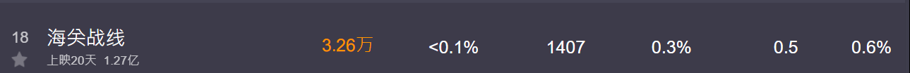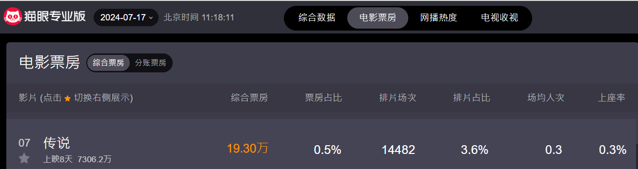 貓眼實時電影票房數據。 港產片由電影演員成龍、謝霆鋒主演的《傳說》和《海關戰線》分別於7月10日和6月28日推出,據貓眼實時票房統計,不如預期,目前《傳說》上映8天,票房7306萬,上座率僅0.3%,《海關戰線》上映20天僅1.27億票房,上座率僅為0.6%。