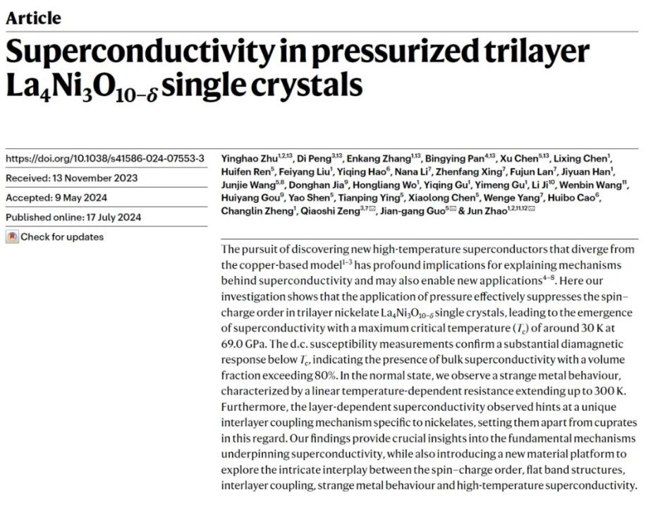 最新研究成果刊發於《自然》。復旦大學供圖 據新華社報道,超導體是指在特定溫度條件下電阻為零且呈現完全抗磁性的材料,能廣泛應用於電力傳輸和儲能、醫學成像、磁懸浮列車、量子計算等領域。 趙俊介紹,研究高溫超導的一個重要課題是尋找新型高溫超導體,這既能從新的角度尋找理解高溫超導機理的線索,同時新的材料體系也可能提供新的應用前景。