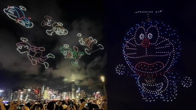 香港中通社7月20日電(記者 陳偉根)20日晚,在香港尖東海域上空,約一千架無人機編織出一幅幅多啦A夢的經典畫面,吸引了數以萬計市民和遊客駐足觀賞。這是繼5月以來,香港舉辦的第二場多啦A夢主題無人機表演。 隨著夜幕降臨,維多利亞港上空逐漸呈現出多啦A夢、大雄、靜香、胖虎和小夫等角色的面孔,還有時光機等標誌性道具。伴隨著熟悉的旋律,每個場景都巧妙地觸動了觀眾的情感和回憶。 本次匯演連帶無人機升降,持續了大約15分鐘,其中內容部分較首場略長,有大約10分鐘。匯演的高潮是多啦A夢、大雄和小夫等角色,戴著竹蜻蜓在空中飛翔的場景,現場瞬間沸騰,觀眾們仿佛重返無憂無慮的童年時光。