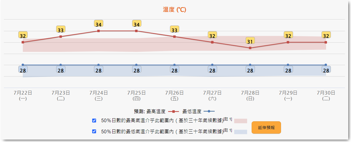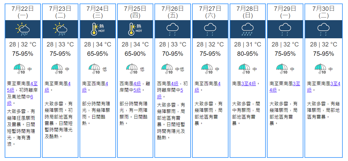 未來9天氣溫預報。香港天文台截圖 另外,熱帶風暴格美昨(21日)增強為強烈熱帶風暴。在21日晚上11時,格美集結在馬尼拉之東北約530公里,預料向北移動,時速約10公里,橫過菲律賓以東海域並顯著增強。 對此香港天文台指,熱帶氣旋派比安會在今日(22日)橫過海南島,進入北部灣,隨後移向廣西至越南北部一帶並逐漸減弱。與其相關的狂風驟雨及雷暴會在今日影響廣東沿岸,該區風勢較大。此外,熱帶氣旋格美會在未來一兩日大致移向台灣以東海域並顯著增強,受其外圍下沉氣流影響,中國東南部本週中期天氣酷熱,亦有幾陣驟雨。預料一股西南氣流會在本週後期影響華南沿岸,為該區帶來不穩定天氣。(完) 【編輯:豐悅】