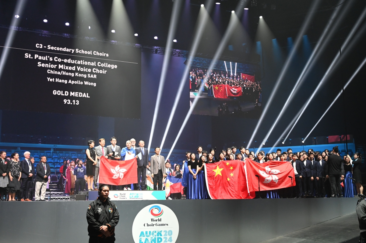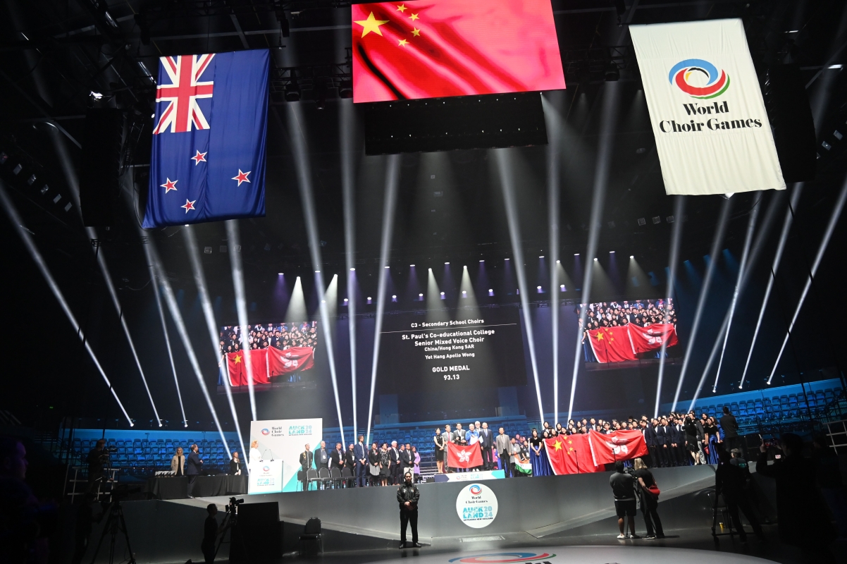 香港新聞網7月23日電 香港中學合唱團揚威國際,賽後頒獎典禮上的一幕更令觀者動容。 香港聖保羅男女中學近日在新西蘭舉行的第十三届世界合唱比赛中取得佳績。聖保羅男女中學的網頁亦刊出喜訊:“恭喜我校高級混聲合唱團在新西蘭奧克蘭第十三屆世界合唱比賽中以93.13分的成績榮獲金獎,並成為中學合唱團冠軍組冠軍。學院合唱團也獲得金獎,並以94.75的成績獲得當代音樂混聲冠軍組第二名。”
