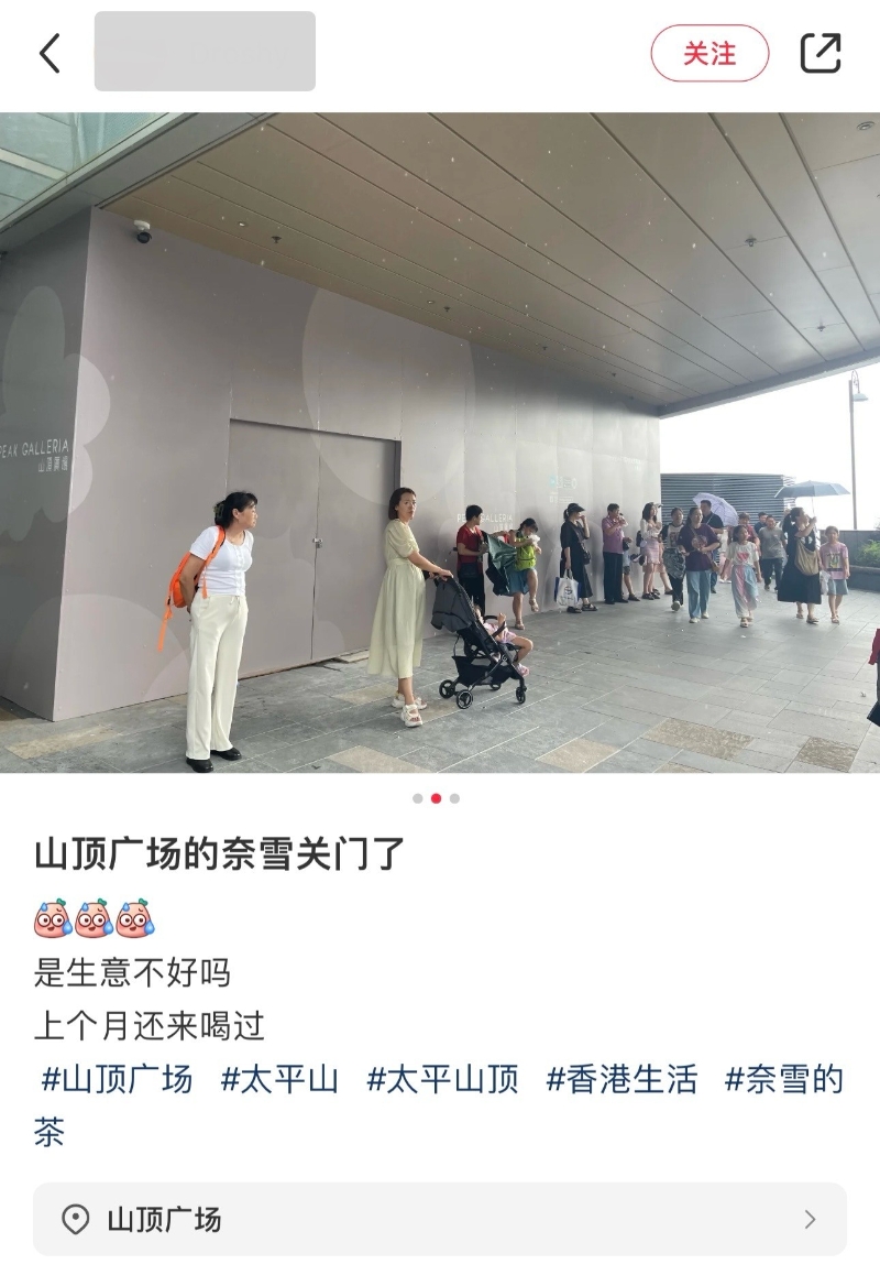 “奈雪的茶”山頂廣場門店已結業。(小紅書截圖) 一名網民在社交平台“小紅書”上表示,發現山頂廣場的奈雪的茶分店已經關門,並表示相當驚訝“是生意不好嗎?上個月還來喝過”。從照片可以看到,原本“奈雪的茶”門店已被商場的圍板覆蓋。有網民留言指“昨天(本月20日)去也發現關了”,有人認為“網紅店起家的在香港不會存活太久”、“根本水土不服,這樣的店已經出現持續關閉撤離的狀態”、“山頂廣場生意通常不行啊,上次晚上八點多去的,好冷清”;也有人表示即使在深圳“都N年無飲”。