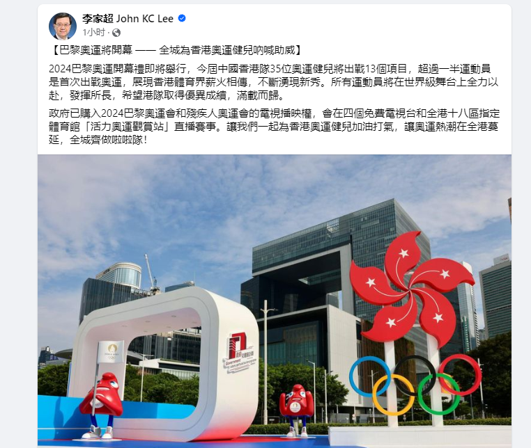 李家超FB发文。 李家超表示,政府已購入2024巴黎奧運會和殘疾人奧運會的電視播映權,會在四個免費電視台和全港十八區指定體育館“活力奧運觀賞站”直播賽事。讓我們一起為香港奧運健兒加油打氣,讓奧運熱潮在全港蔓延,全城齊做啦啦隊! (完) 【編輯:錢林霞】