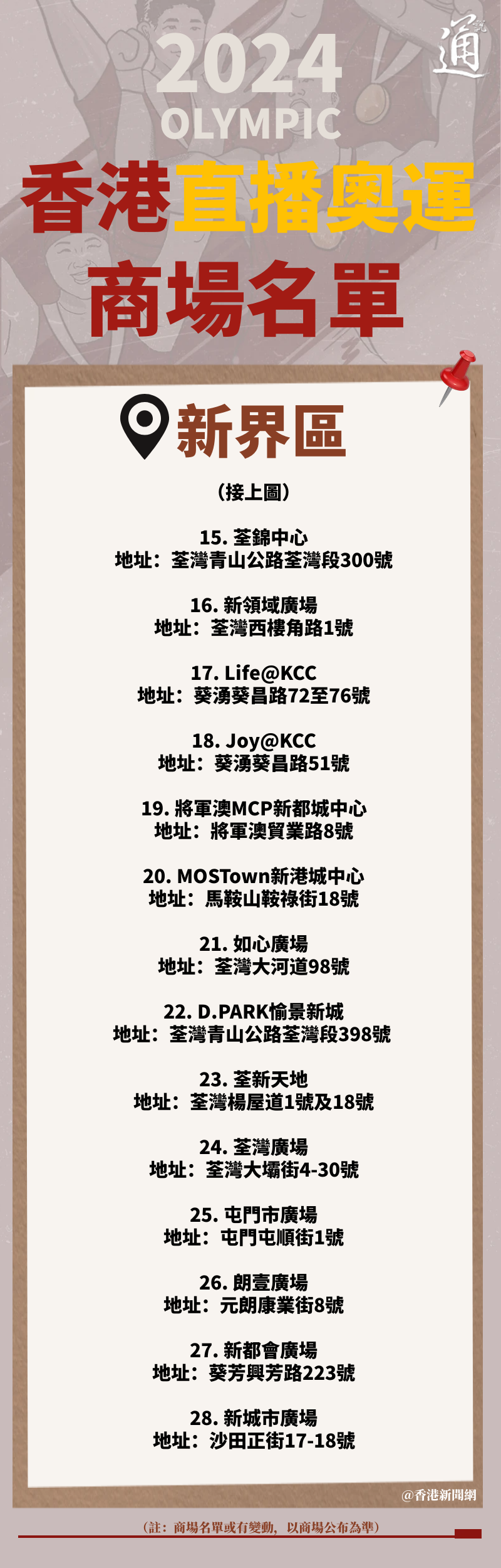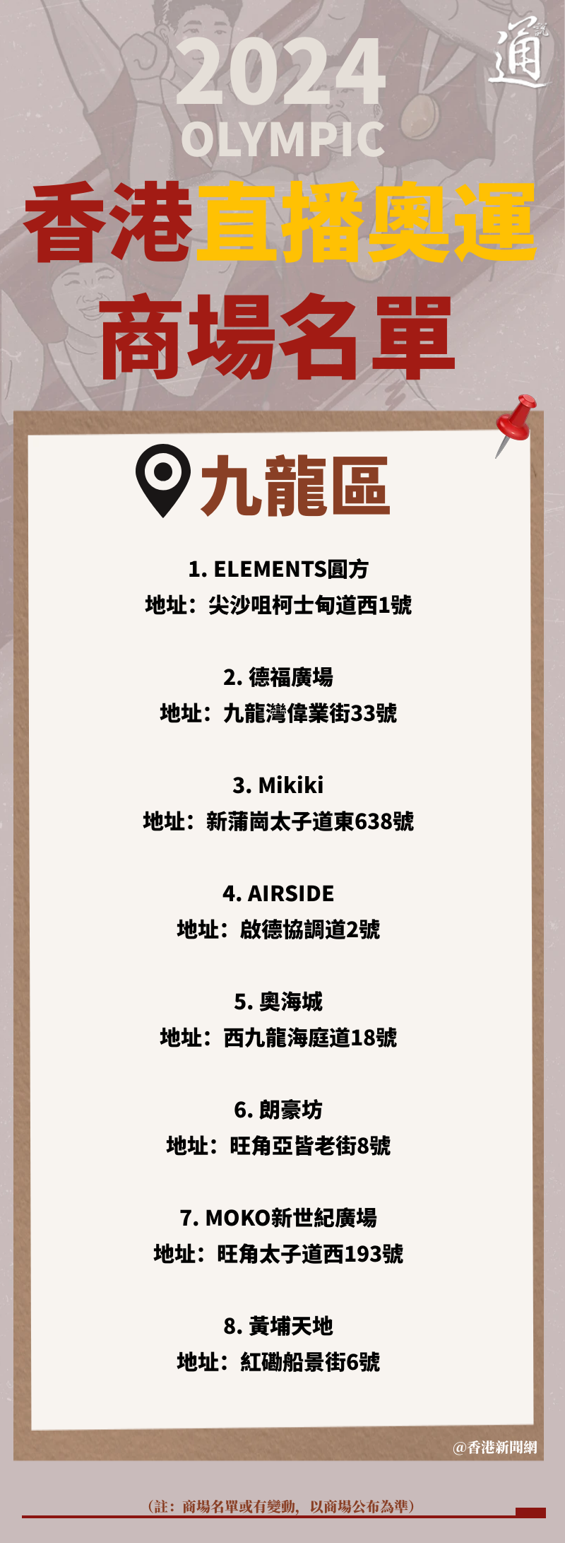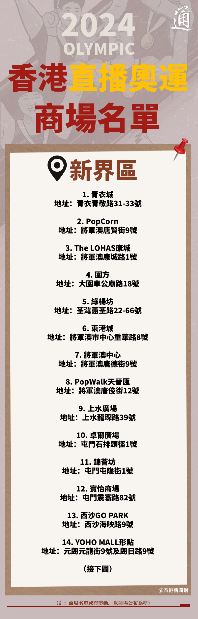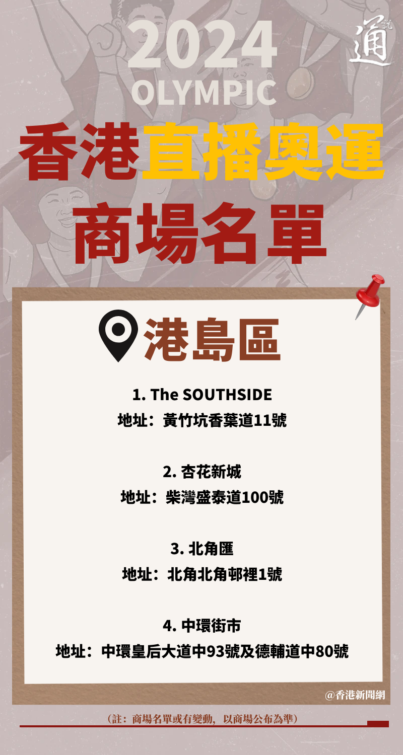 香港新聞網7月26日電 巴黎奧運會將於香港時間明天(27日) 凌晨1點30分在法國巴黎開幕。全港約40多個商場設置超大熒幕,將直播精選奧運賽事。這些商場遍布港九新界,包括中環街市、奧海城、愉景新城等,方便各區市民免費觀看比賽。直播奧運商場名單一覽(註:商場名單或有變動,以商場公布為準)