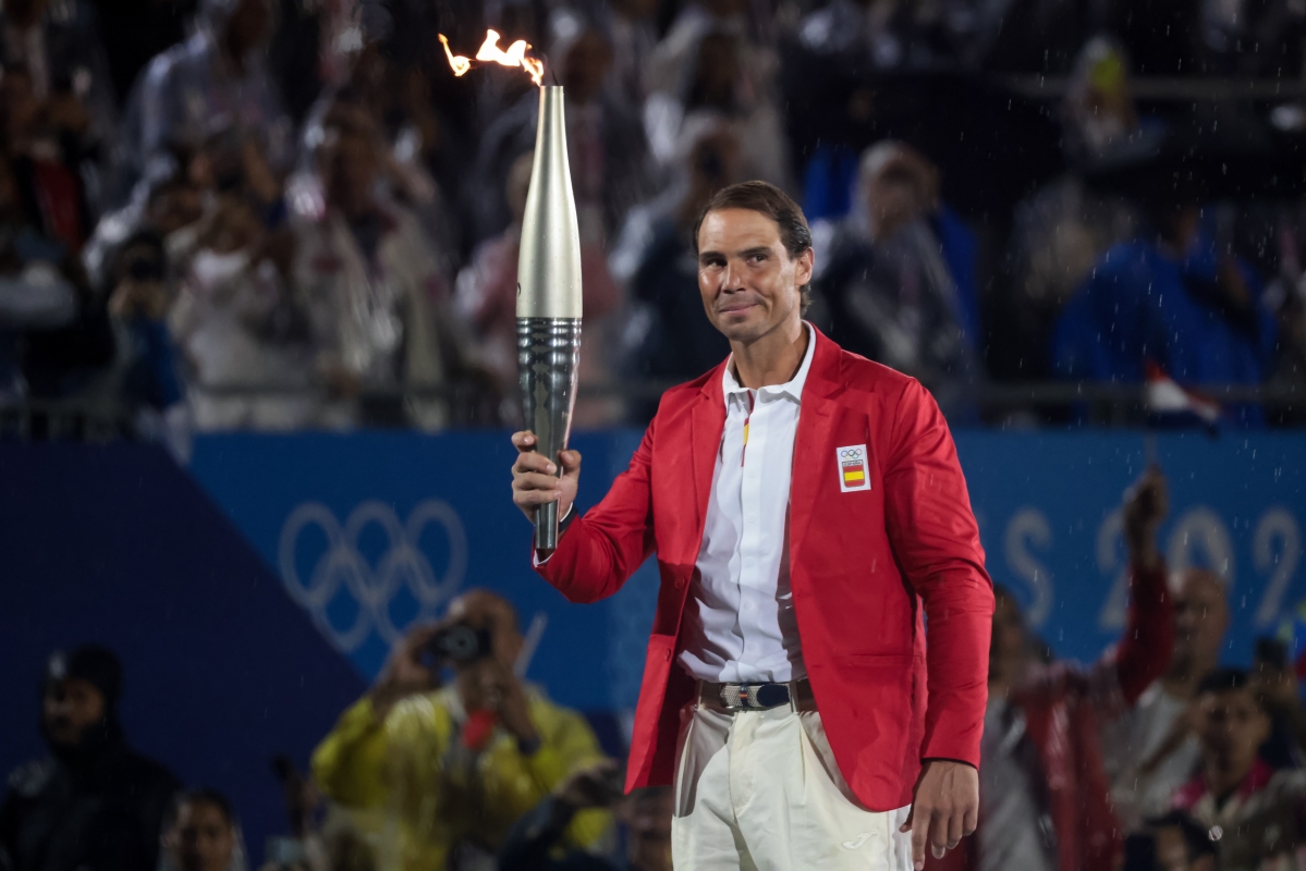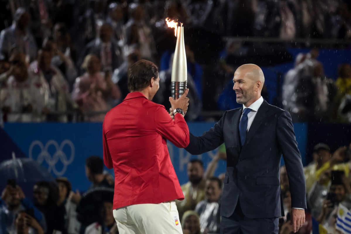 法國足壇名宿齊達內(右)將火炬交給了網壇巨星納達爾