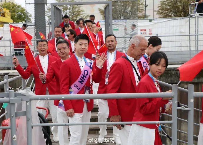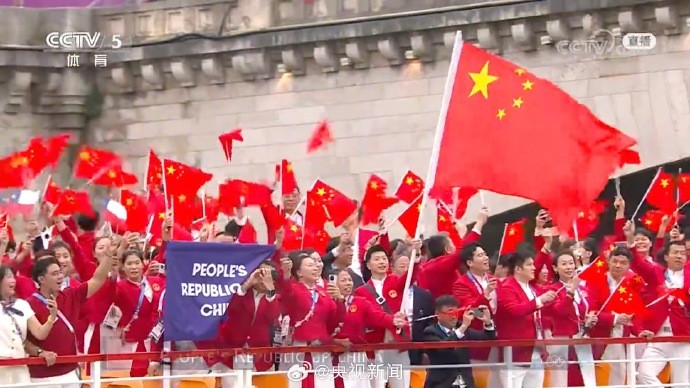 這個細節還原了1911年《蒙娜麗莎》被盜事件,1913年《蒙娜麗莎》物歸原主,這之後,《蒙娜麗莎》越來越受人矚目了。 最耀眼的中國紅 巴黎奧運開幕式,中國代表團旗手是男子乒乓球運動員馬龍、女子花樣游泳運動員馮雨。中國代表團由405名運動員組成,參加42個項目的比賽。405名運動員當中,有42名奧運會冠軍,也有223名首次參加奧運會的新人。