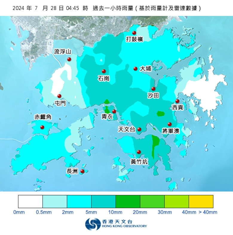 截至7月28日凌晨04:45過去一小時本港雨量分佈,個別地區多於10毫米。香港天文台圖 香港天文台在上午5時50分發出之有關黃色暴雨警告信號的特別報告,指香港廣泛地區已錄得或預料會有每小時雨量超過30毫米的大雨,且雨勢可能持續。 天文台提示,一些低窪地帶及排水欠佳的地區會出現水淹。可能受大雨及水浸影響之市民應採取適當的預防措施,以防止可能引致的損失。大雨可能引致山洪暴發,市民應遠離河道。可能受河道氾濫影響之市民應採取適當的預防措施,以避免損失。請留意電台或電視台廣播有關交通情況及其他有關暴雨消息之報告。