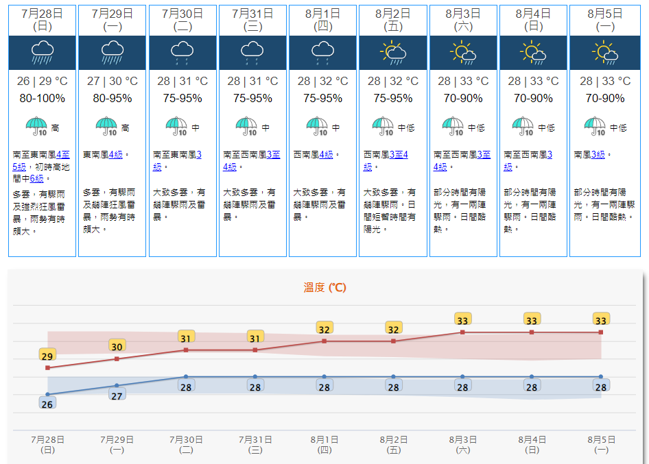未來9天天氣預報。香港天文台圖 具體天氣情況,香港天文台預報指,一道廣闊低壓槽正為廣東沿岸帶來大驟雨及雷暴。本港方面,今早(28日)多處地區錄得超過30毫米雨量。在今晨8時,熱帶低氣壓格美集結在武漢之東南偏南約70公里,預料向西北移動,時速約10公里,橫過湖北並逐漸消散。 天文台預測,香港地區今天(28日)天氣為多雲,有驟雨及強烈狂風雷暴,雨勢有時頗大。最高氣溫約29度。吹和緩至清勁南至東南風,初時高地間中吹強風。明日(29日)有驟雨及幾陣狂風雷暴,雨勢有時頗大。本週中期仍有幾陣驟雨。 對於未來天氣概況,香港天文台指,廣闊低壓槽會在未來一兩日為華南沿岸及南海北部帶來大驟雨及狂風雷暴。預料該低壓槽會在本週中期稍為減弱,但廣東沿岸仍有幾陣驟雨。隨著高空反氣旋逐漸增強,本週後期中國東南部天色較為明朗。此外,現時為菲律賓以東海域帶來不穩定天氣的低壓區會在未來一兩日逐漸發展,大致移向台灣至呂宋海峽一帶。(完) 【編輯:許豐悅】
