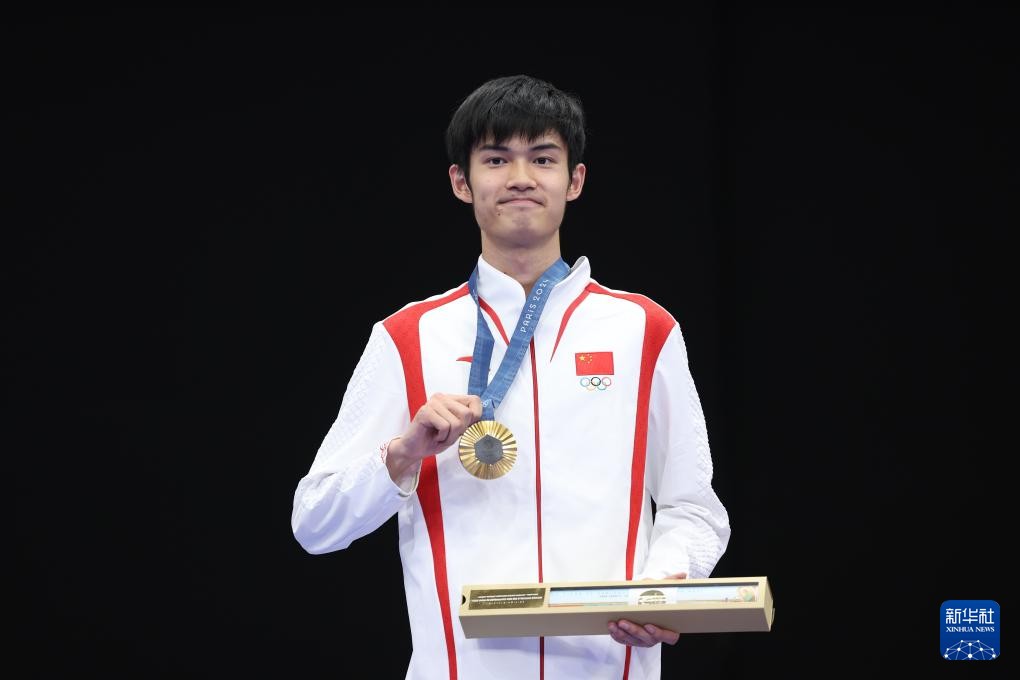 7月29日,冠軍中國選手盛李豪在頒獎儀式上。新華社圖片