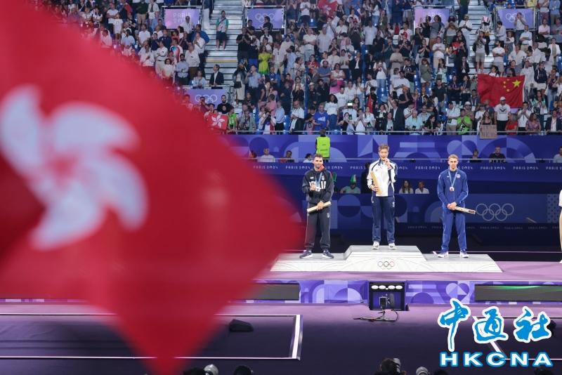 圖為頒獎典禮。(香港中通社記者 謝光磊 攝) 香港中通社圖片 張家朗:香港地方雖小 但相信自己就能做很多事 張家朗賽後強調,要以正面心態面對每場比賽,亦證明香港雖是很小的地方,但只要相信自己就能做到很多事。 張家朗形容連贏兩屆奧運是人生最美妙的時刻之一,更因為港隊花劍教練來自法國,令這次經歷更加特別,亦碰巧7月正值他的父親生日,剛好以金牌作為禮物。他又提到,在今次比賽前都感覺狀態一般,但決心要以正面心態打好每場比賽,即使落敗也要拚盡每一劍,最重要是相信自己,不要因為香港是一個很小的地方,就放棄而不去堅持。