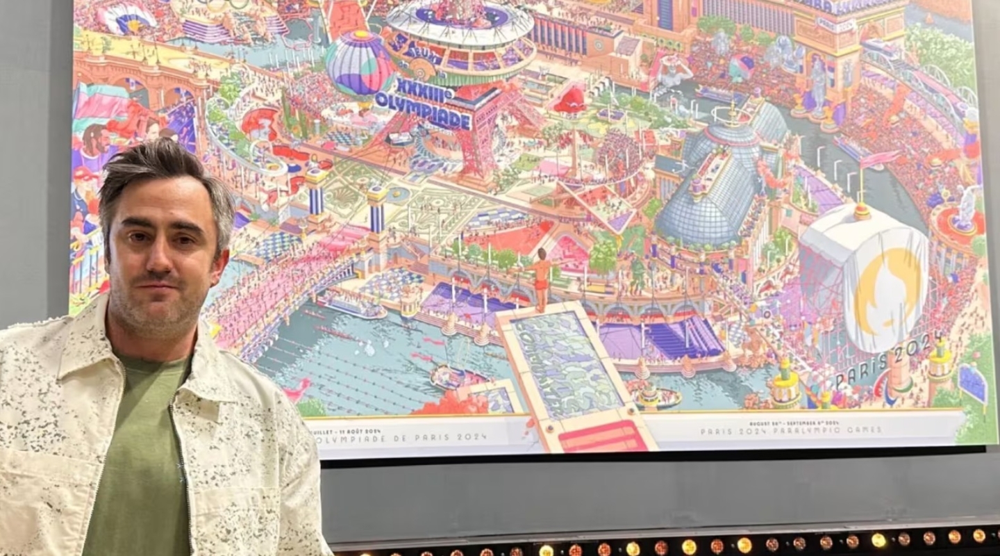 法國藝術家Ugo Gattoni與他繪製的巴黎奧運全幅海報。(圖源:巴黎奧運官網)
