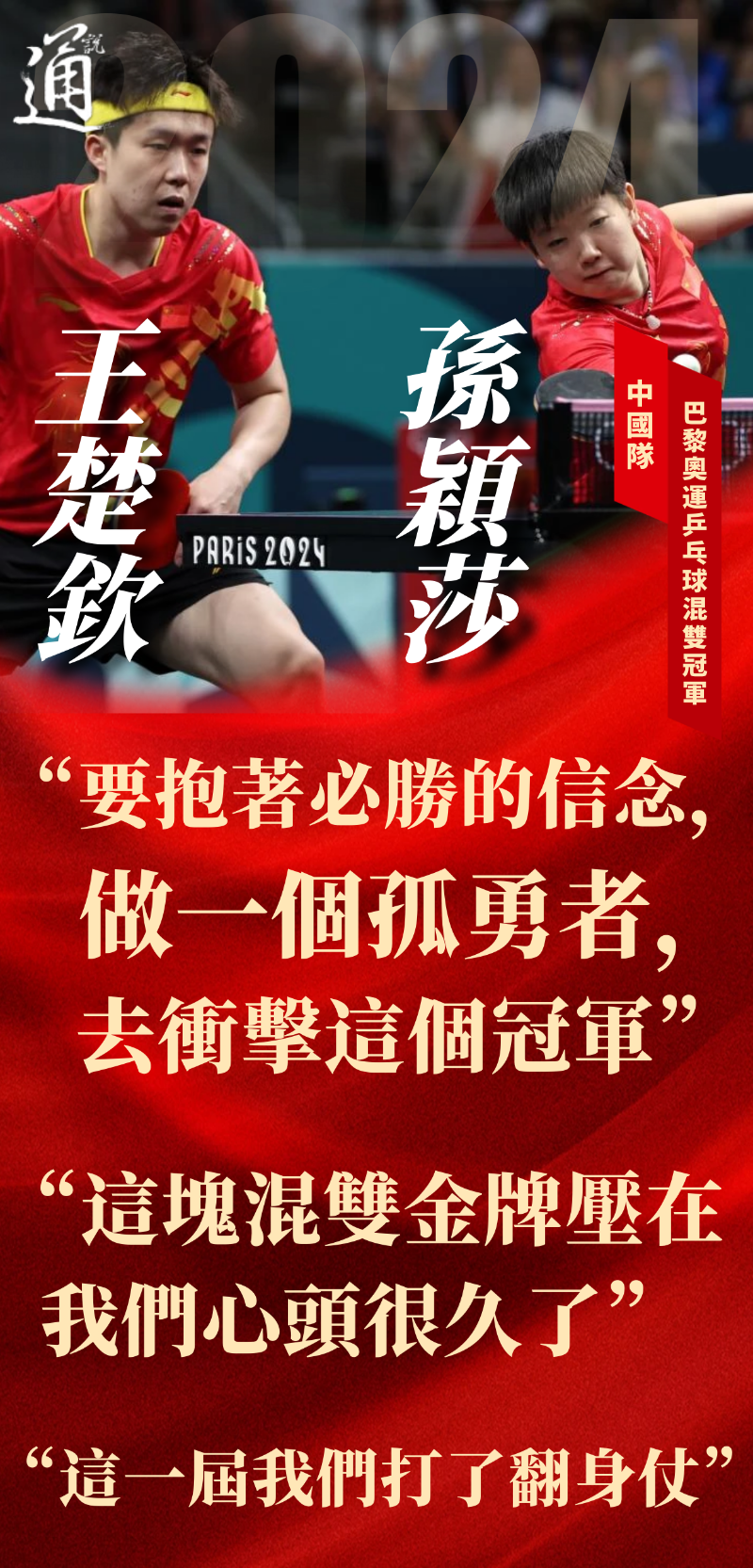 (巴黎奧運)冠軍語萃:做一個孤勇者 像奪第一塊金牌時激動香港中通社7月31日電 當地時間30日,巴黎奧運會進入第四個比賽日,繼續見證新的體育傳奇。這一天,中國乒乓球隊拿下奧運混雙金牌;美國“體操女王”拜爾斯強勢回歸,帶領隊友完成 “救贖之旅”。體育健兒們在奧運賽場上書寫歷史,他們在賽後的真情流露亦讓人無限感動。 30日,在巴黎奧運會乒乓球混雙決賽中,中國組合王楚欽/孫穎莎以4:2戰勝有“神秘之師”之稱的朝鮮組合李正植/金琴英,贏得金牌。這不僅是中國乒乓球隊在本屆奧運會上的首金,也是其歷史上首枚奧運會混雙金牌。 混雙在東京奧運會上首次被列為乒乓球正式比賽項目,但“昕雯聯播”的失利令中國隊未能實現包攬五金的計劃。 此次的巴黎奧運,在沒有冠軍經驗、沒有第二支中國組合、沒有退路的情況下,王楚欽和孫穎莎成了混雙項目上的“孤勇者”。 “我們要抱著必勝的信念,做一個孤勇者,去衝擊這個冠軍。”王楚欽說。為此,他在日常訓練中不斷“壓榨”自己,保持了兩年從早六練到晚十的訓練強度。 孫穎莎亦在備戰過程中不斷給自己加壓。她說,“只有平時給自己施加的壓力超越奧運會對手帶來的壓力,我們倆才能在奧運賽場上習慣跟適應。” 戰勝“神秘之師”的那一刻,孫穎莎俯身高喊,王楚欽握拳慶祝。 “這塊混雙金牌壓在我們心頭很久了,我之前也說過,我想用生命換回這塊金牌,今天我做到了。”捍衛“夢之隊”榮譽的王楚欽感慨萬千。