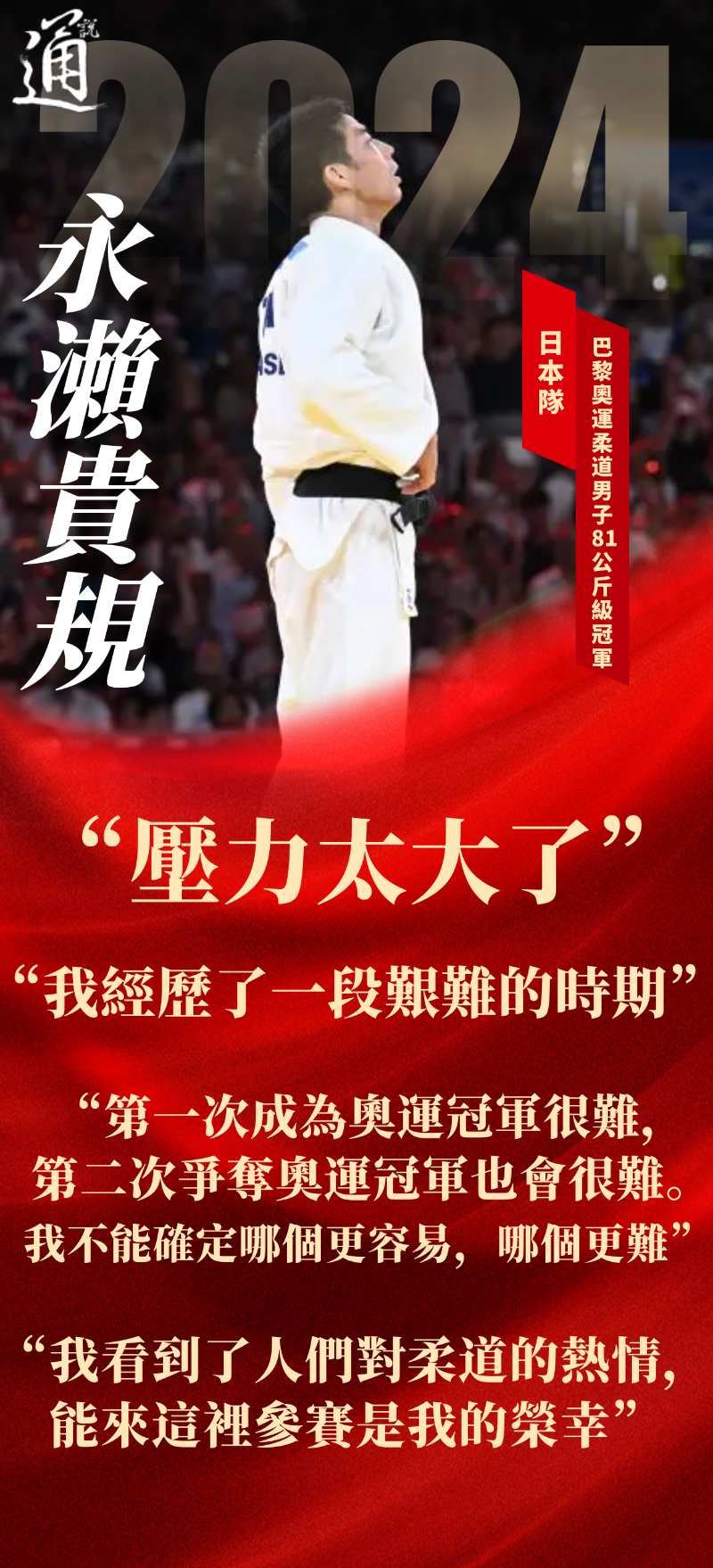 (香港新聞網製圖) 日本選手永瀨貴規也通過巴黎奧運會重新確立了自己的傳奇地位。在柔道男子81公斤級決賽中,面對格里加拉什維利,永瀨貴規送出一個技有以及一個技驚四座的一本,成功衛冕。 儘管手握東京奧運會柔道項目男子81公斤級金牌,但成為奧運冠軍後的幾年內,永瀨貴規沒能贏得一個外界認為有份量的冠軍頭銜。 來到巴黎賽場的永瀨貴規坦言“壓力太大了”,由於不是種子選手,他只能從32強淘汰賽打起。每輪比賽後前往混合採訪區,永瀨貴規在一眾熱情應答記者提問的運動員中顯得異常沉默,有意避談更多比賽相關的內容。直至決賽結束,他才終於打開話匣子。