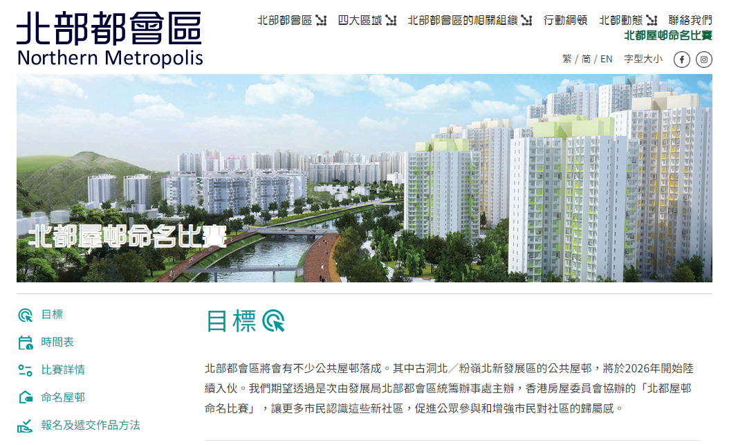 香港新聞網8月1日電 由香港特區政府發展局北部都會區統籌辦事處(北都辦)主辦、香港房屋委員會(房委會)協辦的北都屋邨命名比賽1日開始接受報名,歡迎市民就古洞北/粉嶺北新發展區兩個稍後落成的公共屋邨提出中文命名建議。