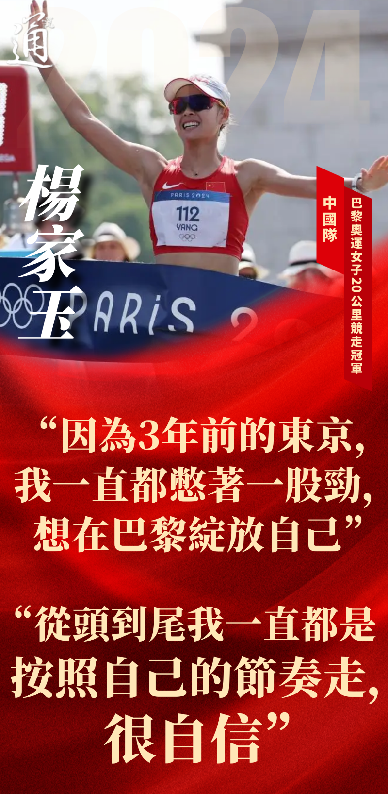 (巴黎奧運)冠軍語萃:憋著勁在巴黎綻放 划槳前想獎牌就會落後香港中通社8月2日電 當地時間8月1日,巴黎奧運會第六個比賽日,繼續上演著動人的奧運故事。這一天,中國體育代表團斬獲2金,並首次在本屆奧運田徑賽場折桂;來自新西蘭的“冠軍媽媽”賽艇組合逐浪前行,收穫一枚珍貴的金牌。奪冠後的體育健兒們感慨萬千,一句句真摯的話語,傳遞著他們閃閃發光的奧林匹克精神。 1日的女子20公里競走決賽中,世界紀錄保持者楊家玉一騎絕塵,以1小時25分54秒的成績奪得冠軍,為中國田徑隊摘下本屆奧運首金。楊家玉個人在該項目中也實現了集奧運會冠軍、世錦賽冠軍和世界紀錄於一身的大滿貫。 然而,大滿貫之路並非一帆風順。2019年田徑世錦賽,楊家玉被罰出場,無緣決賽。東京奧運會,楊家玉領到第三張紅卡被罰停2分鐘,最後僅獲得第12名。 出征巴黎奧運,楊家玉做了充分準備。“因為3年前的東京,我一直都憋著一股勁,想在巴黎綻放自己。”她說。 決賽進入最後一公里,面對西班牙選手佩雷斯緊追不捨,楊家玉頂住壓力,領先第二名25秒,微笑著衝過終點。“我非常激動,今天這枚金牌等了8年。”楊家玉說:“從頭到尾我一直都是按照自己的節奏走,很自信。”