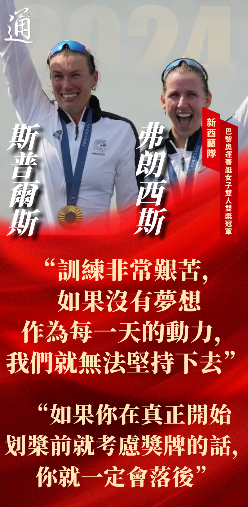 (香港新聞網製圖) 在劉宇坤的描述中,參加奧運類似於“上班”。這種“鬆弛感”讓人想起在奧運會前,劉宇坤在回答如何備戰時説:“該做自己的事情就做自己的事情,不管是奧運會也好,全運會也好,不管是什麼樣的比賽,我要做的事情都是一致的。” 射擊是一項追求高度精準和內心平靜的項目,需要一顆大心臟。隨著生活閱歷的增加,心智愈發成熟的劉宇坤已然可以雲淡風輕地面對成功和失敗。 當日的奧運賽場,賽艇強國新西蘭也收穫一枚女子雙人雙槳金牌。值得一提的是,冠軍組合弗朗西斯/斯普爾斯都是生育不到兩年的“超級媽媽”,讓這枚金牌更顯珍貴。 兩人都是在東京奧運會後成為媽媽。在訓練和比賽期間,她們需要母乳餵養孩子,要努力平衡比賽時的能量輸出和留給孩子的營養。 “訓練非常艱苦,如果沒有夢想作為每一天的動力,我們就無法堅持下去。” 斯普爾斯表示,自己與搭檔經歷類似,因此知道對方感受,“也讓我們建立了對彼此的信任,這成為真正的驅動力。” 決賽中,這對“超級媽媽”組合雖然在開始的500米落後領先者半個船身,但她們非常耐心。在最後500米時,成功反超。 “我們就只是一槳一槳地划。”弗朗西斯說,“如果你在真正開始划槳之前就考慮獎牌的話,你就一定會落後。”