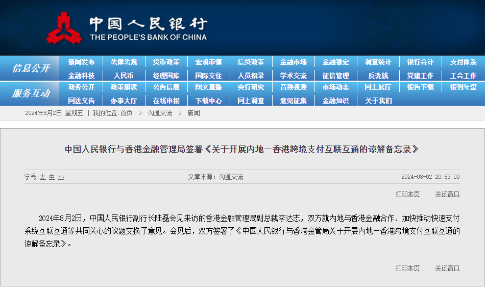會見後,雙方簽署了《中國人民銀行與香港金融管理局關於開展內地-香港跨境支付互聯互通的諒解備忘錄》,為兩地開展跨境支付互聯互通奠定合作框架。(完)