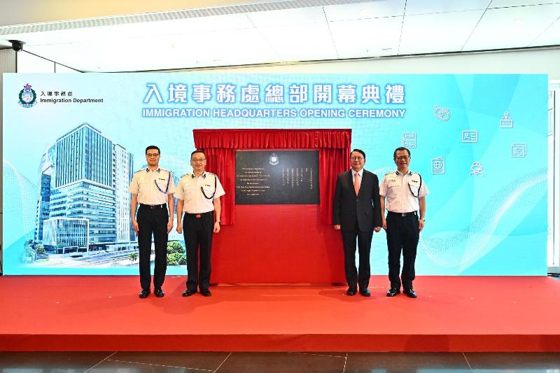 圖示政務司司長陳國基(右二)、入境處處長郭俊峯(左二)、入境處副處長(執法、系統及管理)戴志源(右一)及入境處副處長(管制、簽證及證件)程和木(左一)主持牌匾揭幕儀式。來源:香港政府新聞處 此外,陳國基表示,入境處要繼續與相關中央部委和省市單位緊密聯繫,持續提升各口岸通關能力,包括與深圳有關部門全力推展皇崗口岸重建,並就新皇崗口岸制定“合作查驗、一次放行”通關模式落實細節。
