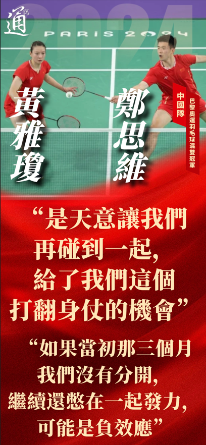相比賽後的情緒激動,賽場上的王宗源卻表現淡定、擁有大心臟。“怕什麽,沒什麽可怕的!”被對手反超時,王宗源這樣安慰失誤的龍道一。 王宗源年僅22歲,但已有奧運經驗的他在跳水隊的綽號卻是“老王”。東京奧運會以來,王宗源的男雙三米板搭檔已更換過多位。“上一屆我是追趕者,這一屆我是引領者,感覺責任更重了。”他說。 因此,每當龍道一發揮出現失誤或壓力大的時候,“老王”王宗源都會及時送上寬慰。“(比賽失誤)是他必須經歷的路,這種時候我就會在下面跟他說加油,相信自己,一個小小的失誤不會影響到後面的比賽。” 有了王宗源的鼓勵,當日的龍道一雖有失誤,但還是頂住了壓力。憑藉最後一跳的出色發揮,他們為中國跳水隊實現了在該項目的奧運兩連冠。 當日,中國隊的好運還延續到了另一個雙人項目。羽毛球混雙決賽中,頭號種子鄭思維/黃雅瓊以六戰全勝、一局未失的戰績登上奧運最高領獎台,為中國體育代表團摘下第13枚金牌。 事實上,這對湊齊混雙大滿貫最後一塊“拚圖”的組合,也曾經歷迷茫、分別、重聚。三年前的東京奧運會,被視為奪冠熱門的他們失利摘銀,之後全運會亞軍、世錦賽一輪游,“雅思”組合隨即陷入迷茫。國家隊教練組看出問題,2022年將“雅思”拆對。 拆對以後,兩人都在新組合中承擔不一樣的角色,也看到了自己的問題。三個月後,他們重新搭檔,並爆發出更強大的能量。 “如果當初那三個月我們沒有分開,繼續還憋在一起發力,可能是負效應。等我們在新環境、新搭檔中度過了這種情緒,回來的時候或許就不需要特別去解決問題了。”鄭思維說。 “升級重組”的“雅思”組合在巴黎一路過關斬將。四分之一決賽,面對曾在東京決賽戰勝過他們的中國隊隊友黃東萍和其新搭檔馮彥哲,“雅思”直落兩局戰勝對方;2日的決賽,在滿場中國球迷的助威聲中,他們又毫無懸念地拿下這場也許是他們人生中最重要的勝利,圓夢奧運金牌。 “是天意讓我們再碰到一起,給了我們這個打翻身仗的機會。”鄭思維在賽後表示,“這三年我們也成長了,我們扛住了壓力。”